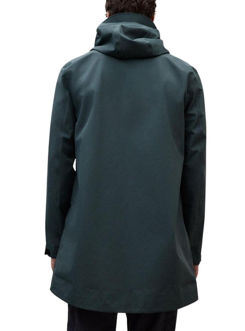 Casaco Ecoalf. Modelo Bald. Cor verde. Impermeável 3K. Fabricado com tecido reciclado. Corte regular. Fecho frontal com zíper. Bolsos frontais. Com capuz ajustável com cordão e pontas. Mangas ajustáveis com velcro. Respirável 3K. Livre de PFCs. O modelo veste tamanho L.