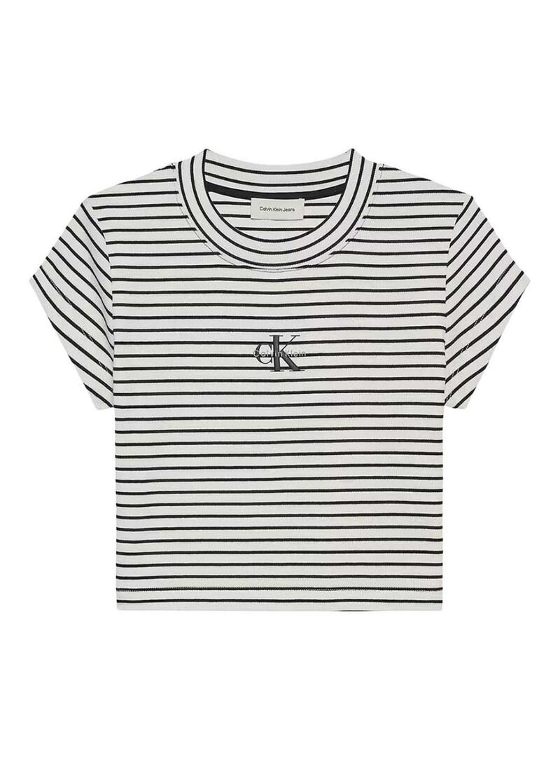 Camiseta Calvin Klein Jeans. Modelo Striped. Cor preto e branco. Listras horizontais. Logo bordado no peito. Gola redonda. Manga curta. Ajuste apertado. Comprimento cropped. Tecido canelado.