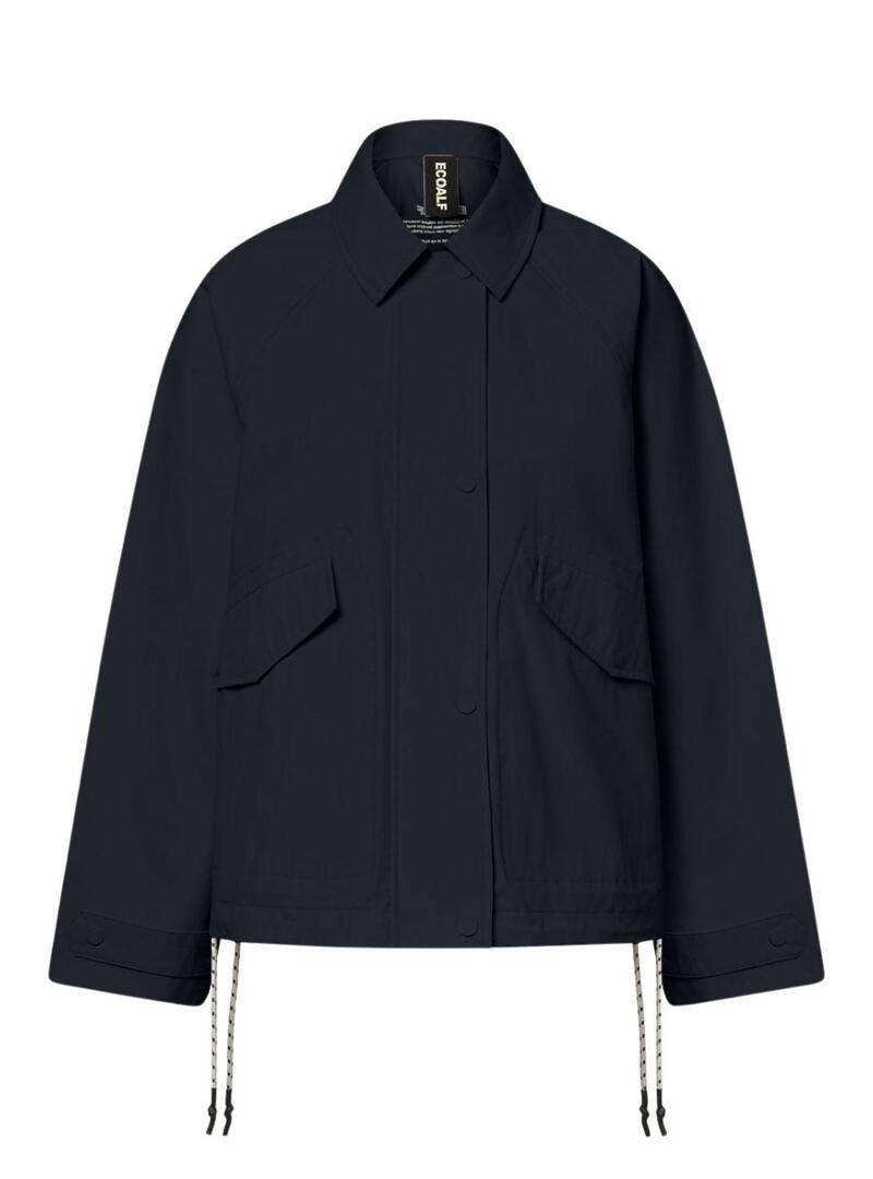 Jaqueta Ecoalf. Cor marinho. Modelo Major. Manga comprida. Fabricado com tecido reciclado. Corte relaxado. Comprimento até a anca. Fecho frontal com zíper oculto e botões. Bolsos laterais com aba. Logotipo da marca nas costas. Barra ajustável com cordão. O modelo veste o tamanho S.