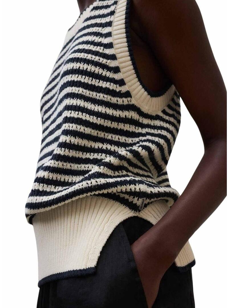 Camisola Ecoalf. Modelo Tulip. Estampa de listras. Ajuste regular. Gola redonda. Sem mangas. Acabamentos canelados. Aberturas laterais. A modelo está usando o tamanho M.