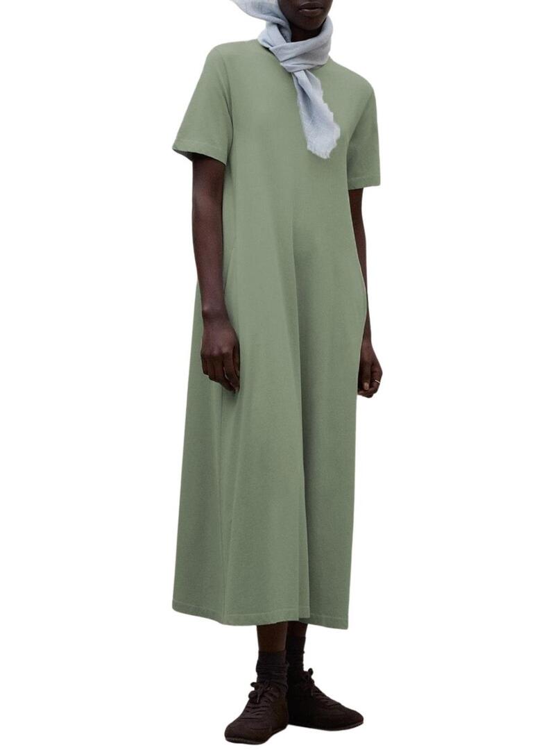 Vestido Ecoalf. Modelo Elettra. Cor verde. Ajuste folgado. Manga curta. Gola redonda. Comprimento midi. Bolsos laterais. A modelo veste o tamanho S.