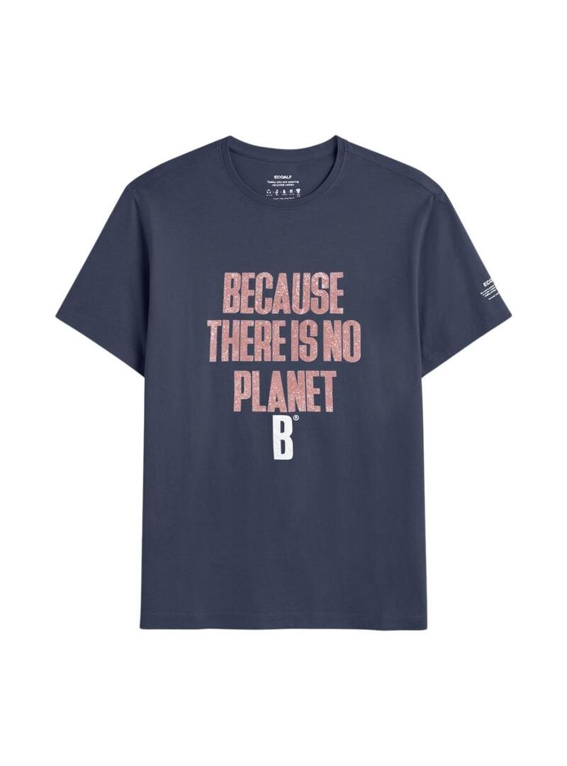 Camiseta Ecoalf. Modelo Min. Cor azul marinho. Gola redonda. Manga curta. Corte regular. Estampa da marca: Because There is no planet B na parte da frente com efeito desgastado.