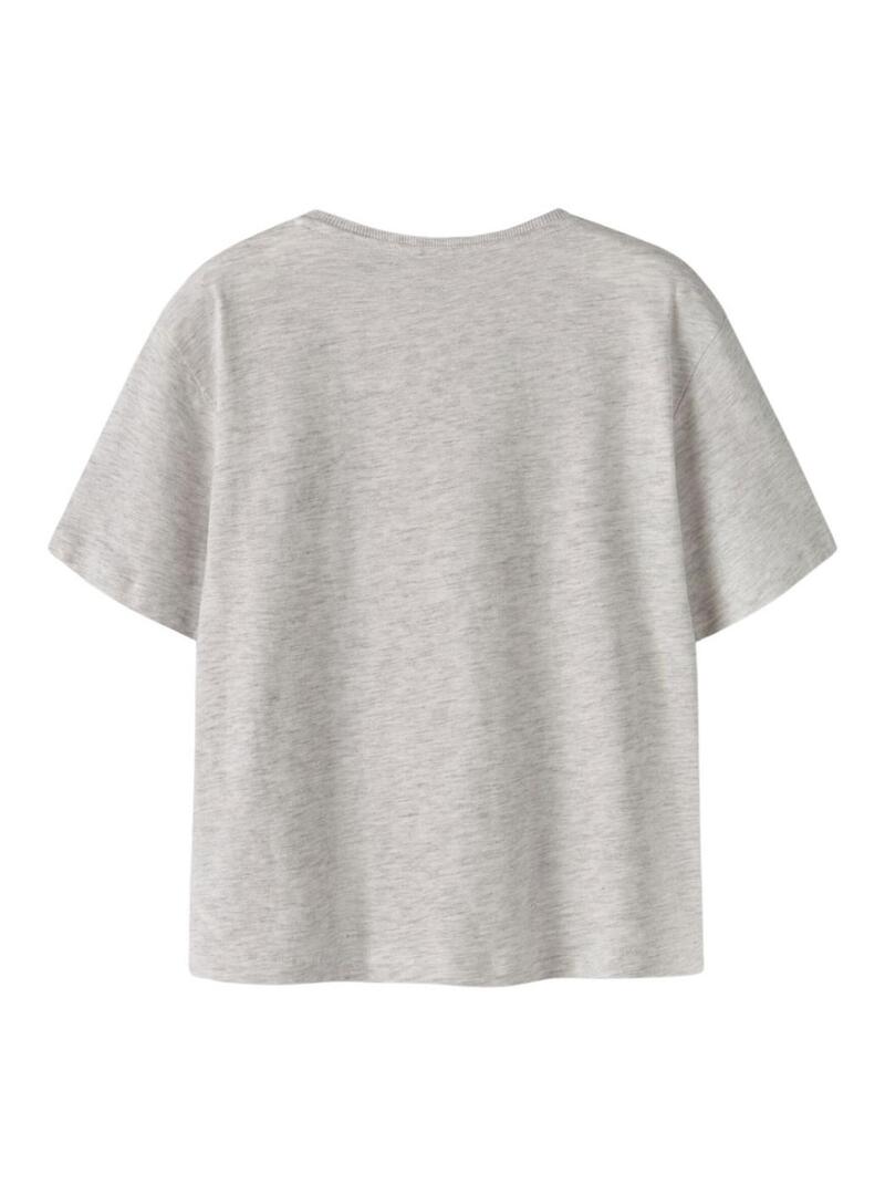 Camiseta Name It. Modelo Benna. Cor cinza claro. Gola redonda. Manga curta. Tecido liso. Estampa frontal de leopardo. Texto Wild and Bold. Sem fecho. Corte reto.
