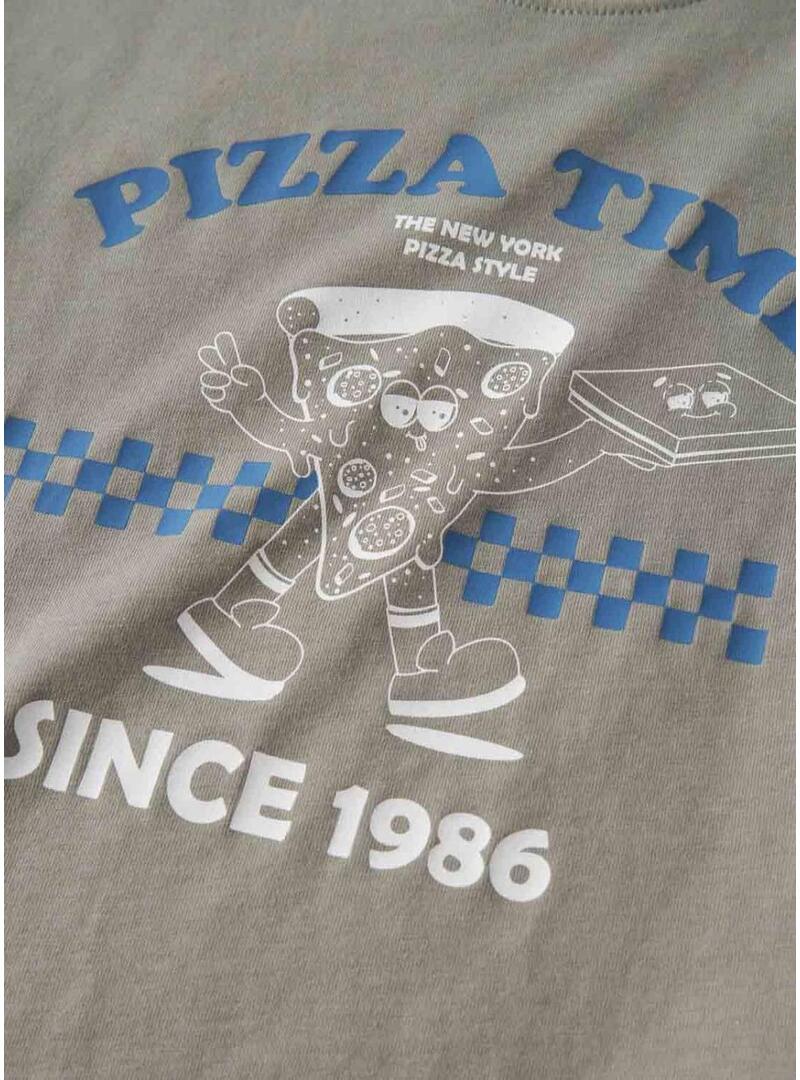 Camiseta Name It. Modelo Benna. Cor cinza taupe. Gola redonda. Manga curta. Tecido liso. Estampa frontal de pizza. Texto frontal. Sem fecho. Corte reto.