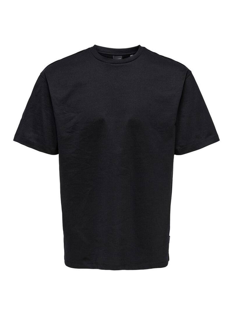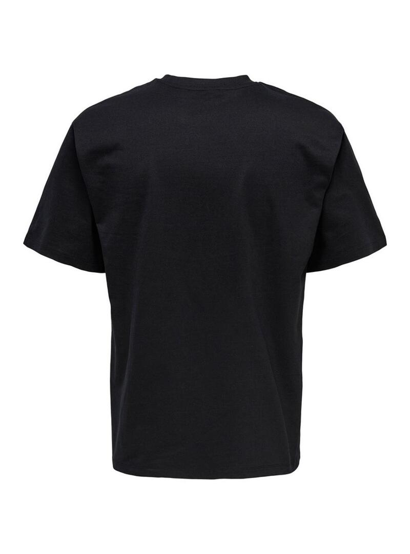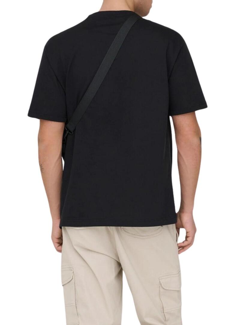Camiseta Only and Sons. Modelo Fred. Cor preto. Gola redonda. Mangas curtas. Corte relaxado. Etiqueta lateral da marca. O modelo veste tamanho L.