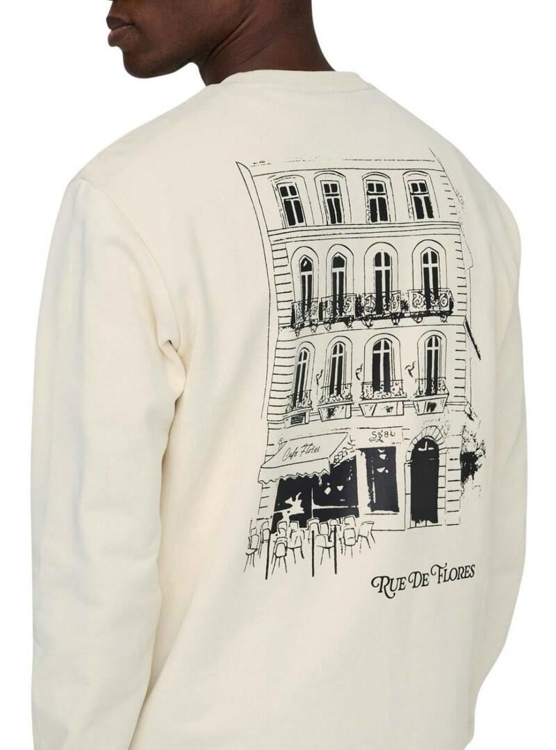 Moletom Only and Sons. Cor bege. Gola redonda. Manga comprida. Formato regular. Estampado no peito. Estampa parisiense nas costas. O modelo está usando o tamanho L.