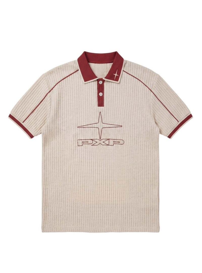 Camisa Polo Projeto x Paris. Corte largo. Cor bege. Gola com aba e dois botões. Manga curta. Malha texturizada. Logo PXP bordado no peito. Acabamento contrastante nos ombros e mangas.