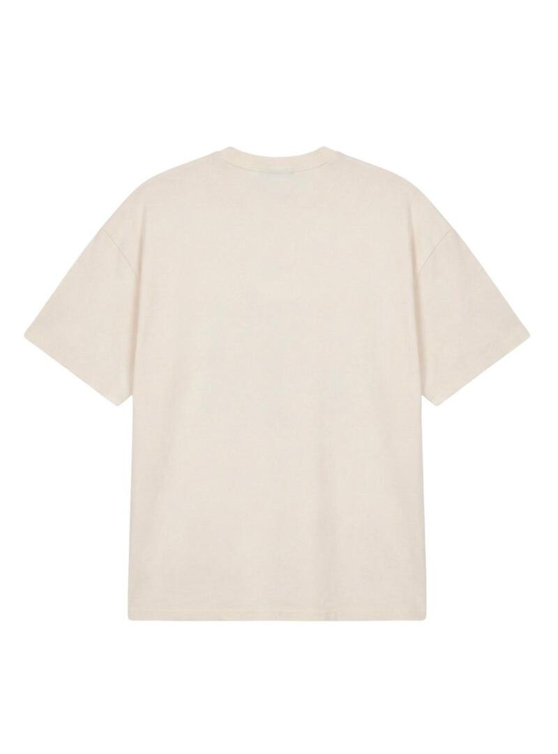 Camiseta Project x Paris. Cor bege. Gola redonda. Corte regular. Estampado com texto e logo no peito. Ombros caídos. Logo de metal costurado na parte de trás do pescoço. O modelo veste o tamanho L.