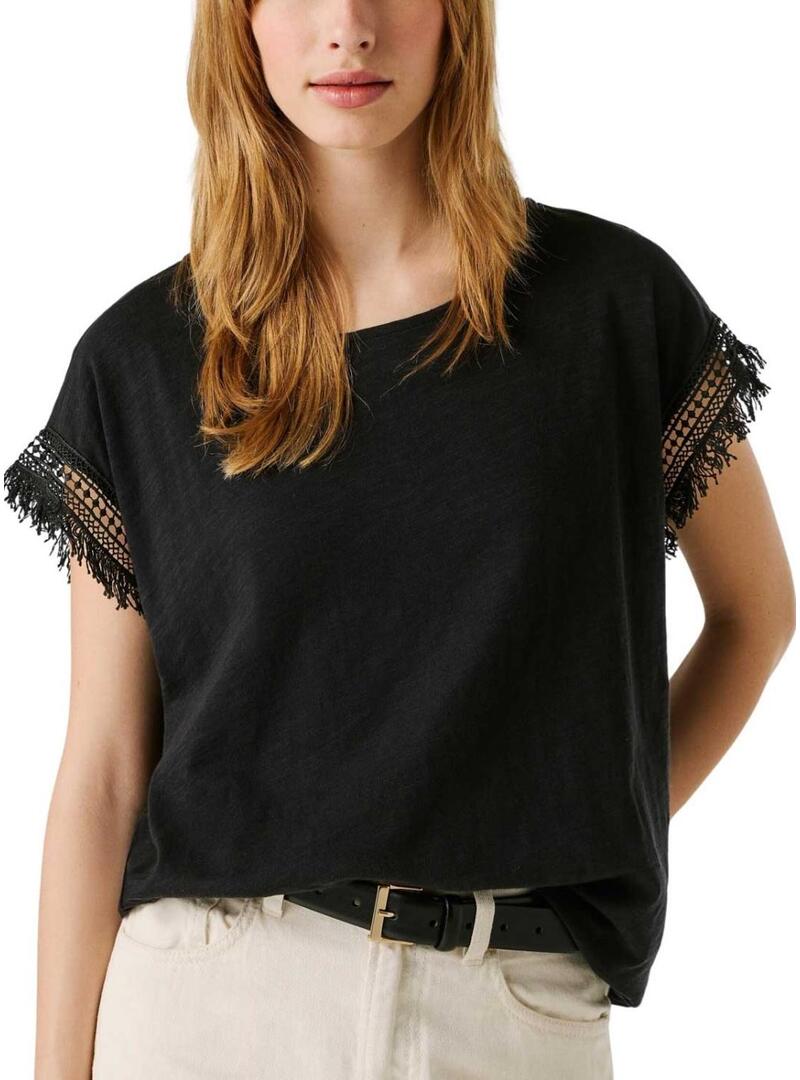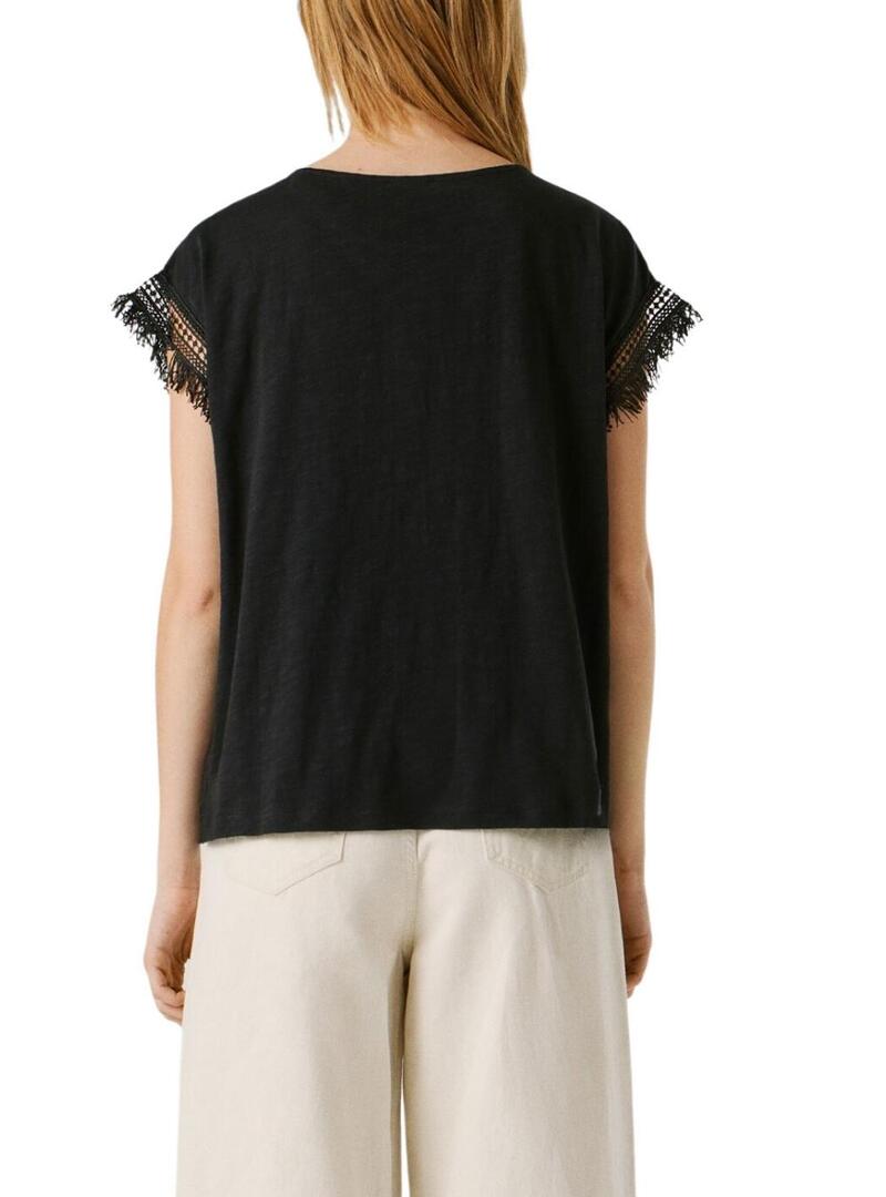 Camiseta Pepe Jeans. Modelo Nain. Cor preto. Gola redonda. Ajuste folgado. Manga curta sem costuras. Extremidades da manga com acabamento bordado e franjas.