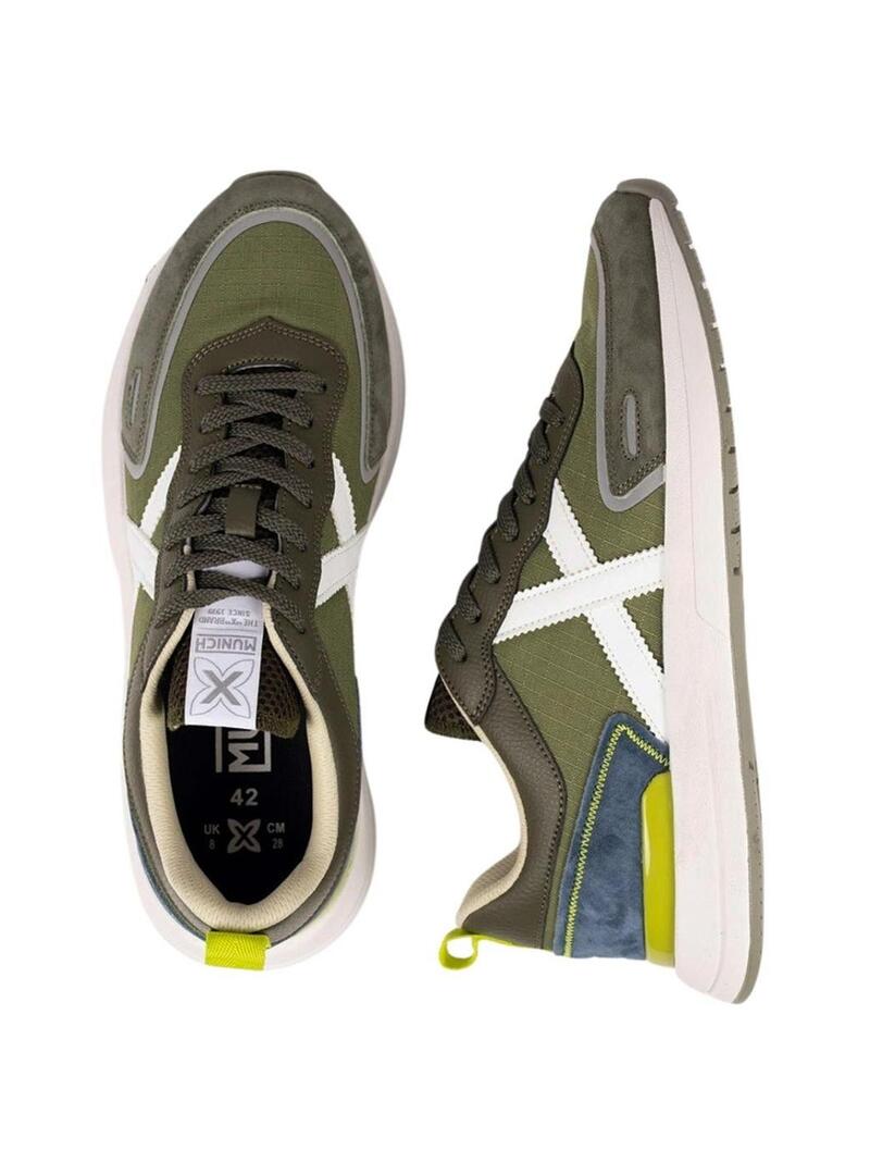 Sapatilhas Munich. Modelo Speed 19. Parte superior que combina materiais têxteis e reforços técnicos. Fecho com cordões. Cor verde com detalhes em azul e amarelo néon. X lateral em branco. Sola de borracha durável.