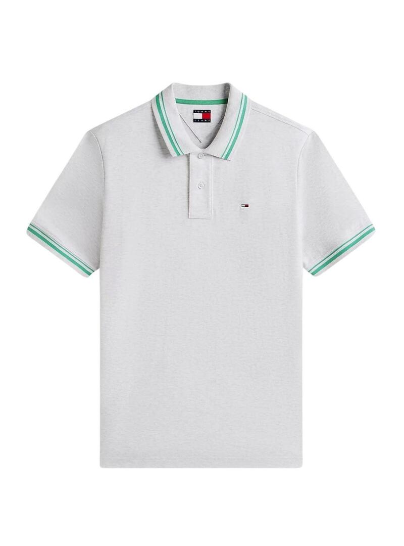 Camisa Polo Tommy Jeans. Modelo Tipped. Cor cinza gelo. Gola com fecho de dois botões. Logotipo bordado no peito. Manga curta. Ajuste regular. Listras verdes na gola e nas extremidades das mangas.