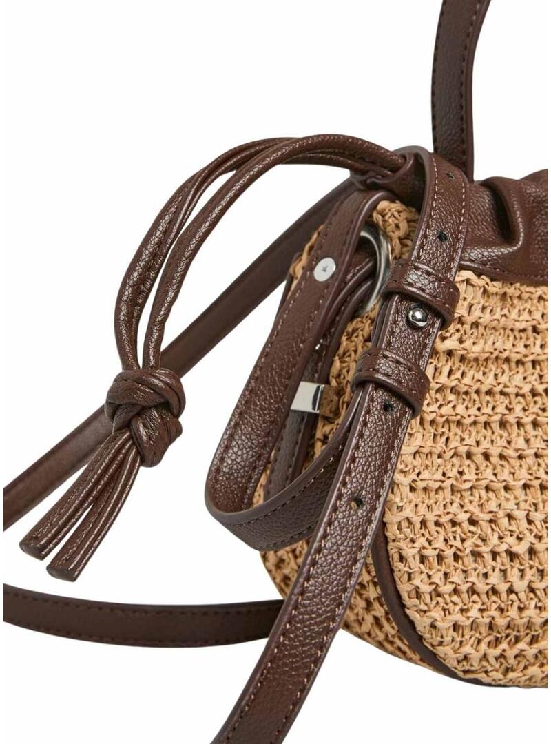 Bolsa Pieces. Modelo Ballan. Cor bege e marrom. Fecho com cordões ajustáveis. Estilo saco. Alça superior para segurar. Alça de ombro ajustável e removível. Dimensões: 17,5 x 24 x 8 cm.