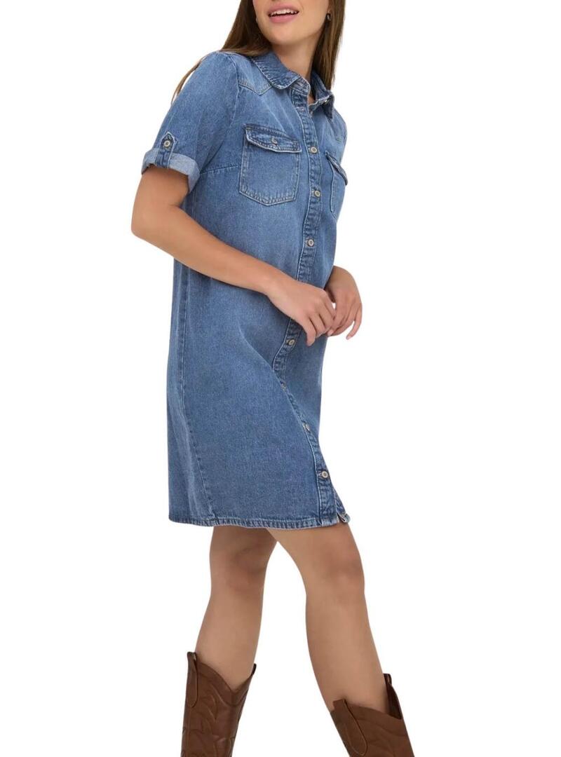 Vestido Only. Tecido denim. Manga curta. Gola camiseira. Fechamento frontal com botões. Bolsos no peito com abas e botões. Corte padrão. A modelo veste o tamanho S.