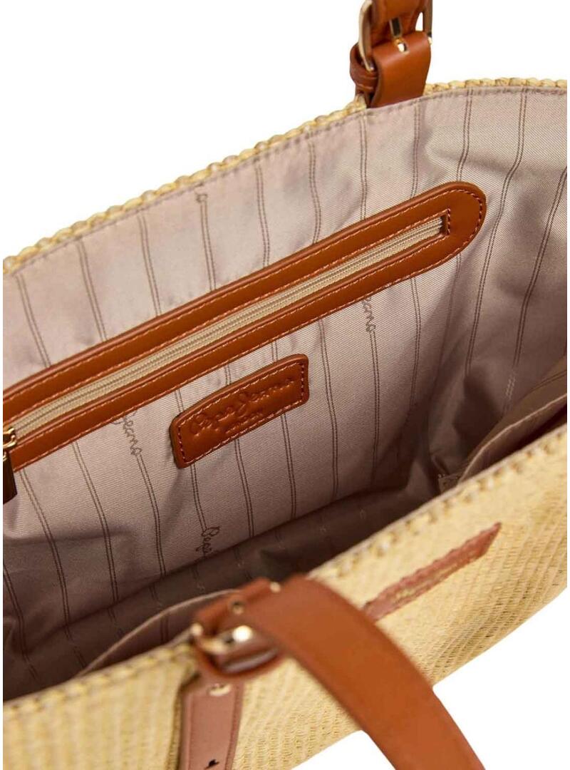 Bolsa Pepe Jeans. Modelo Trudy. Feito de ráfia. Cor natural. Alças de ombro ajustáveis ​​em marrom. Logotipo dianteiro. Formato de leque. Bolso interno com zíper.