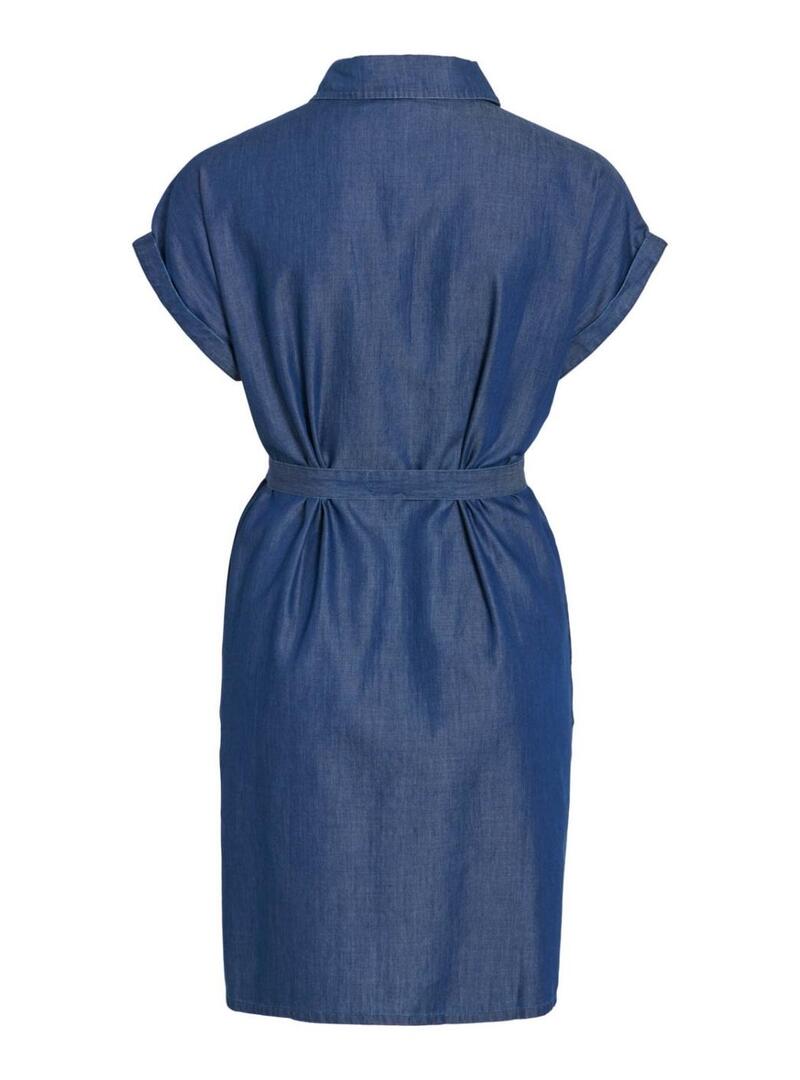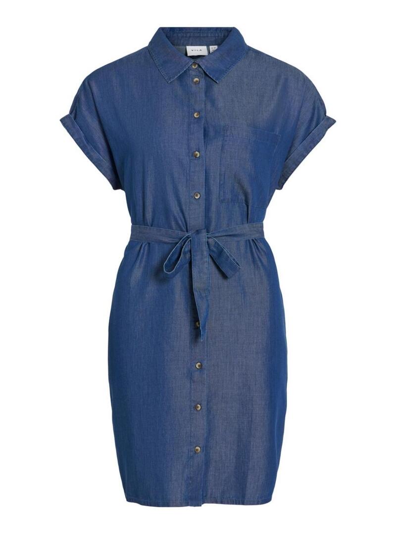 Vestido Vila. Modelo Vinori. Cor azul marinho. Aparência de denim. Tecido leve e fluído. Gola camiseira. Manga curta com dobra. Fechamento com botões estilo bata. Cinto autoamarrado do mesmo tecido. Corte mini.