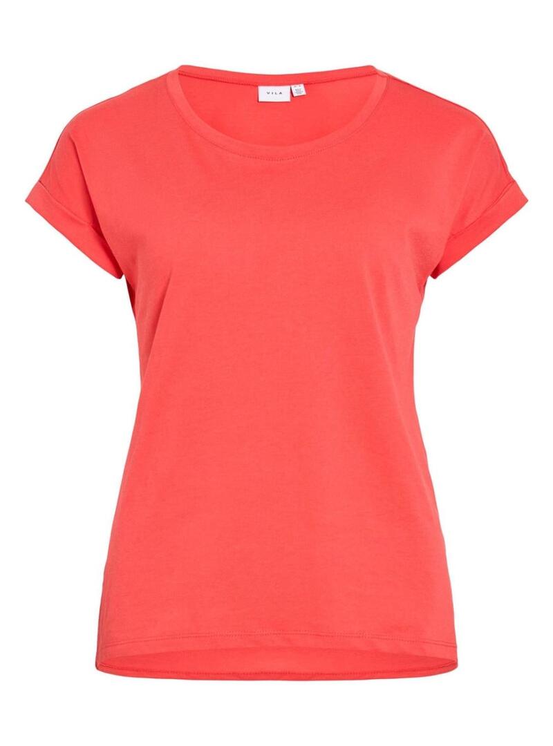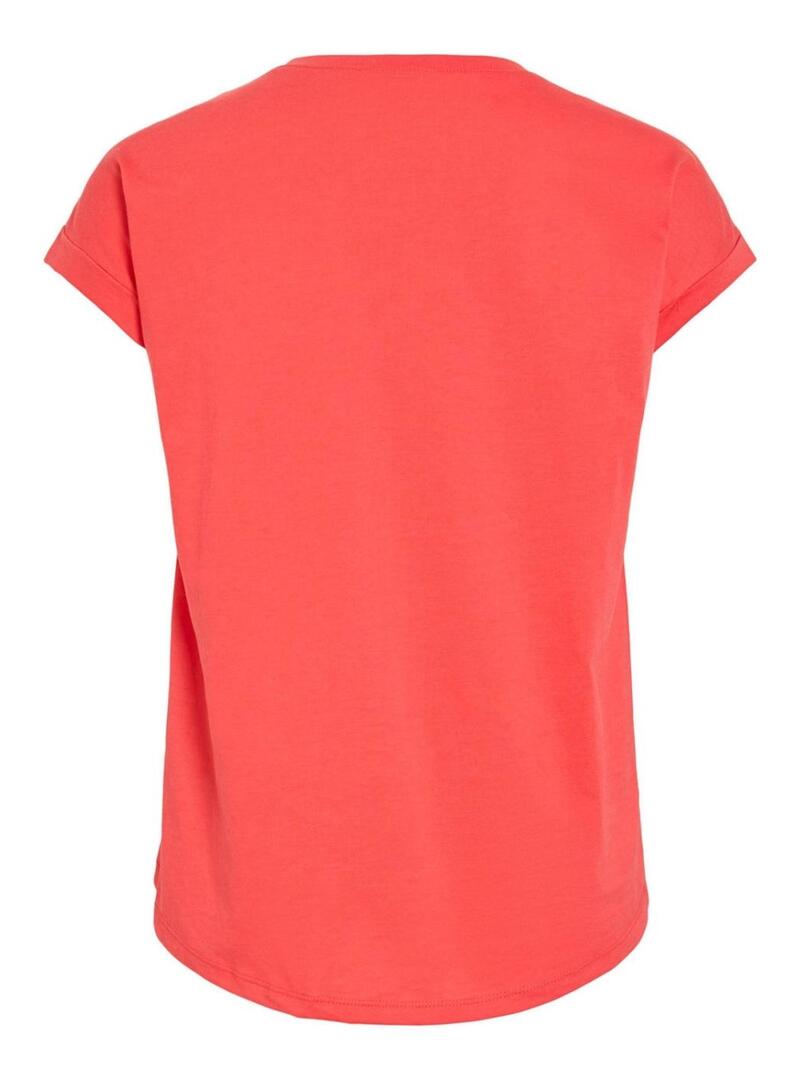 Camisa Vila. Modelo Vidreamers. Cor coral. Gola redonda larga. Manga curta com dobra. Ajuste reto. Estilo básico.