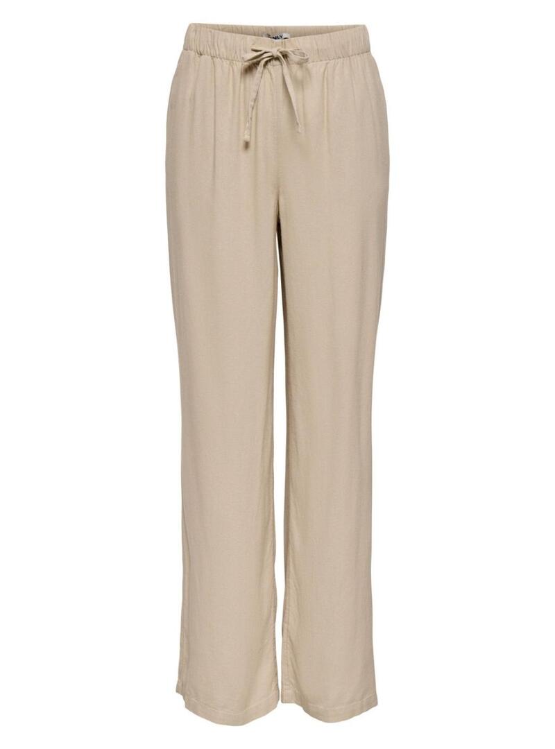 Calça Only. Modelo Goa. Cor bege. Cintura elástica ajustável com cordão. Bolsos laterais. Perna larga. Tecido fluído.