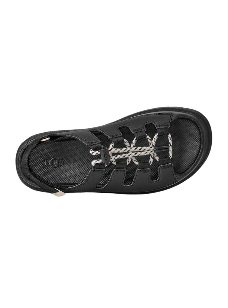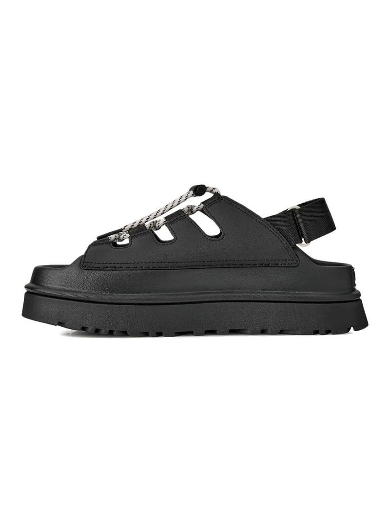 Sandálias UGG. Modelo GoldenGlow Toggle. Cor preta. Parte superior em couro revestido de PU. Fecho frontal com cordões e puxador de plástico. Fecho traseiro com velcro. Cordões feitos com fibras recicladas. Entressola e sola exterior de EVA de cana-de-açúcar.