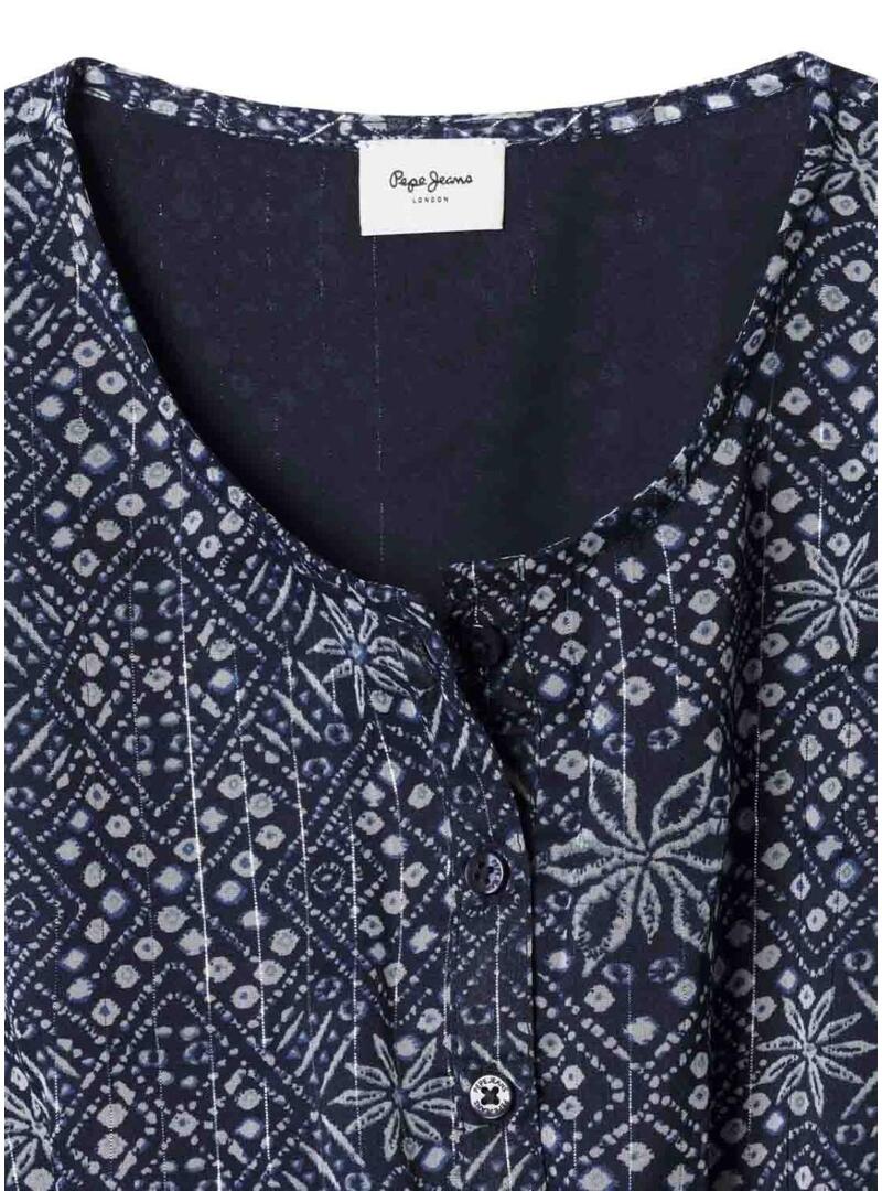 Vestido Pepe Jeans. Modelo Imabel. Cor azul marinho. Formato curto. Tecido leve de chifon. Gola redonda. Fechamento frontal com botões até a cintura. Manga curta estilo borboleta com babados. Cintura elástica com painel de favo de mel. Estampa floral em toda parte. Babados na barra. Interior com forro. Placa metálica com logotipo.
