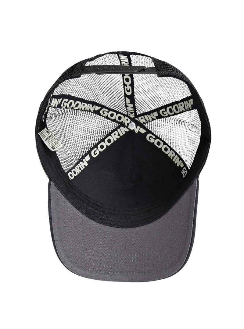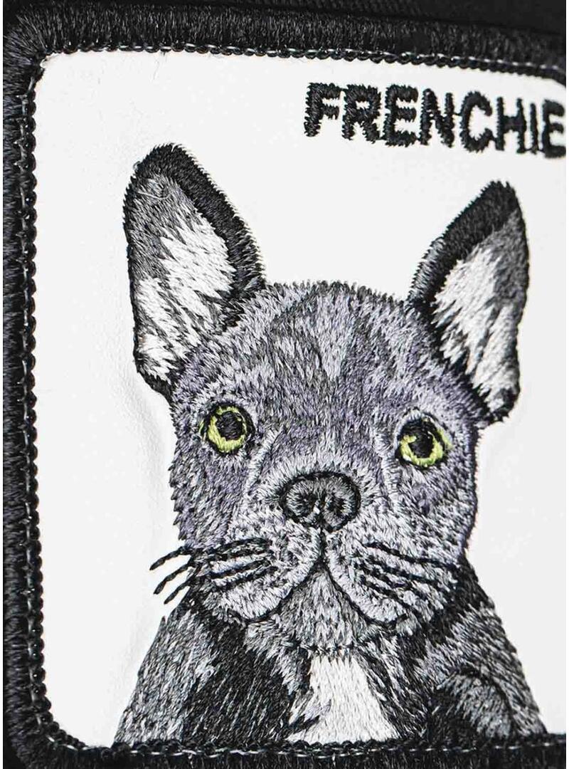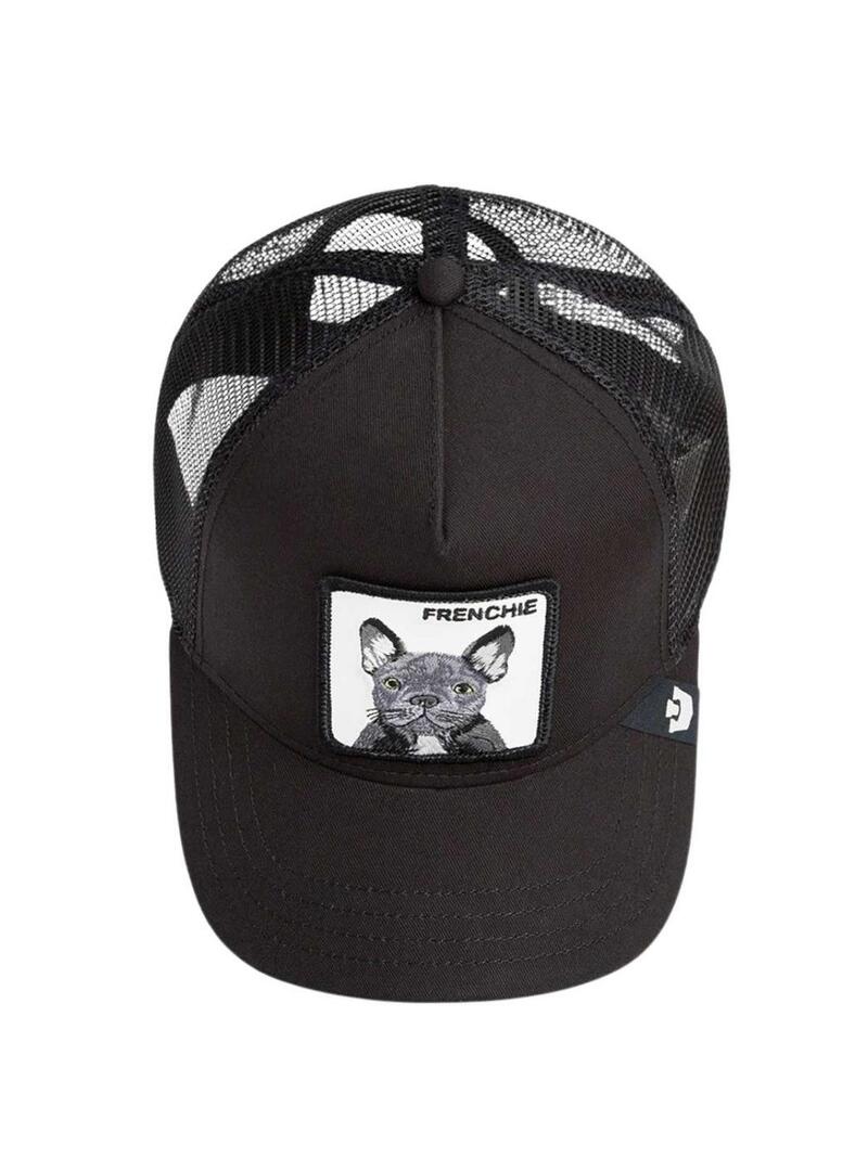 Boné Goorin Bros. Modelo Fenchie. Cor preta. Etiqueta lateral. Ilustração de Bulldog francês bordada na frente. Parte de trás em malha. Fita ajustável na parte de trás. Viseira bicolor em preto e cinza.