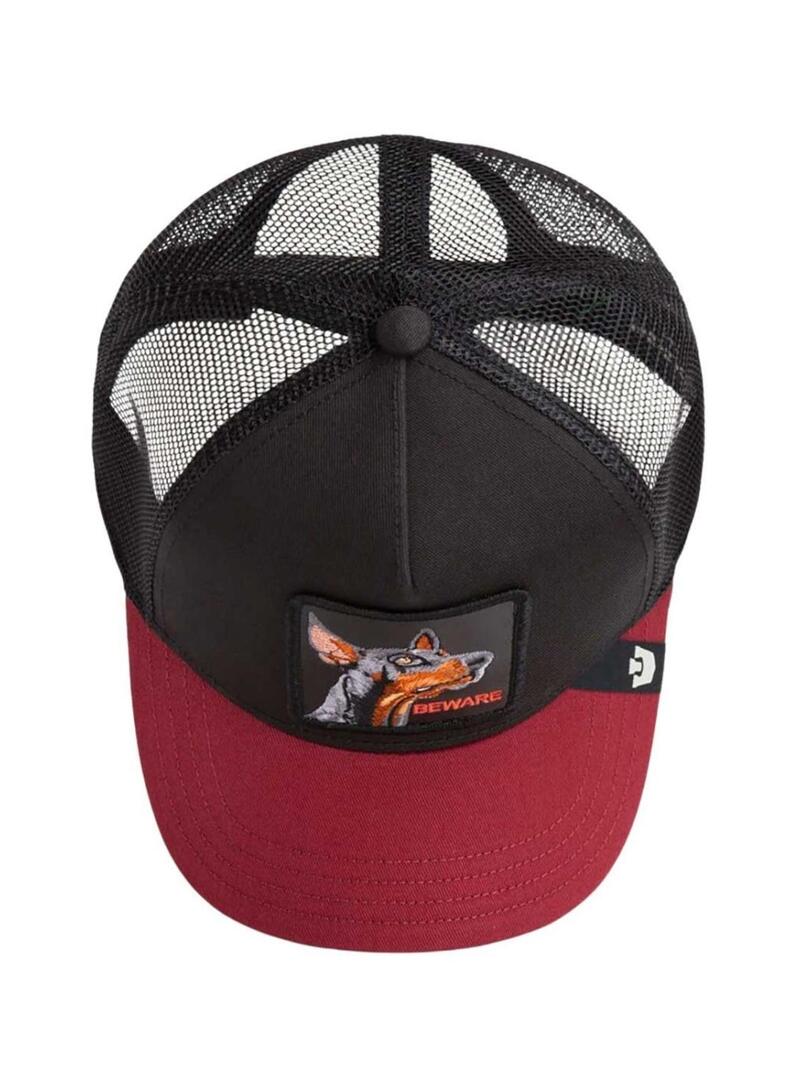 Boné Goorin Bros. Modelo Beware. Cor preta e vermelha. Ilustração de Doberman bordada na frente. Parte de trás em malha. Fita ajustável na parte de trás. Viseira em contraste.