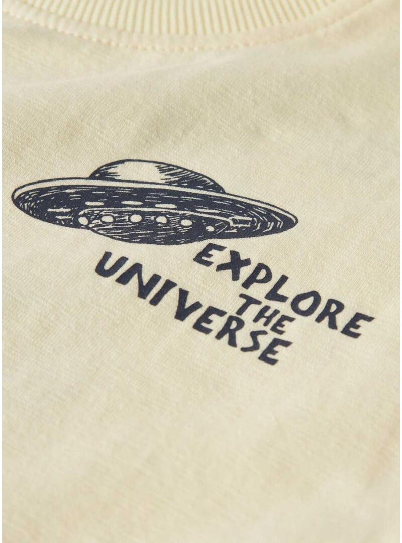 Camiseta Nameit. Modelo Dib. Cor amarela. Gola redonda. Manga curta. Estampa de borracha suave no peito e nas costas. Ajuste regular. Gola canelada.