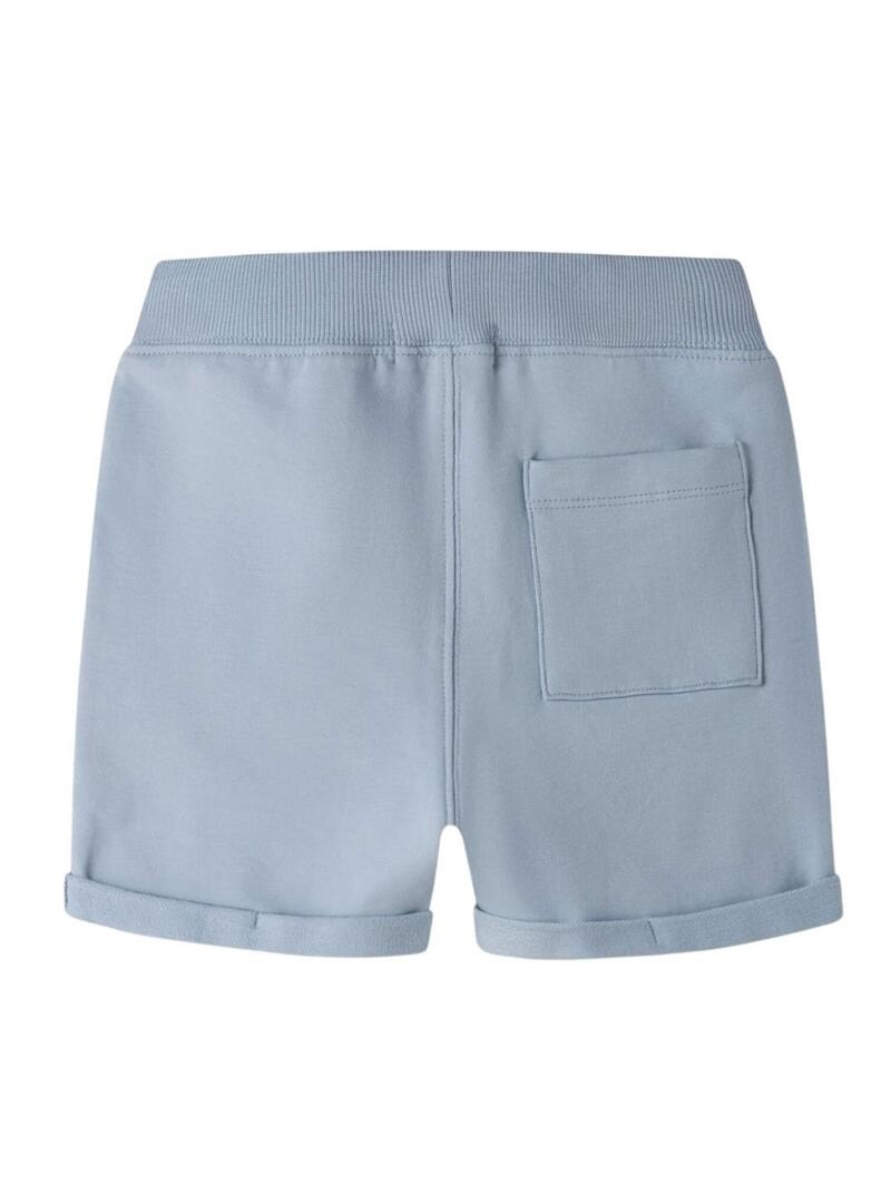 Bermudas Name It. Modelo Dikan. Cor azul. Cintura elástica com cordão ajustável. Tecido de felpa não escovado. Bainhas dobráveis. Ajuste regular. Dois bolsos frontais. Um bolso traseiro.
