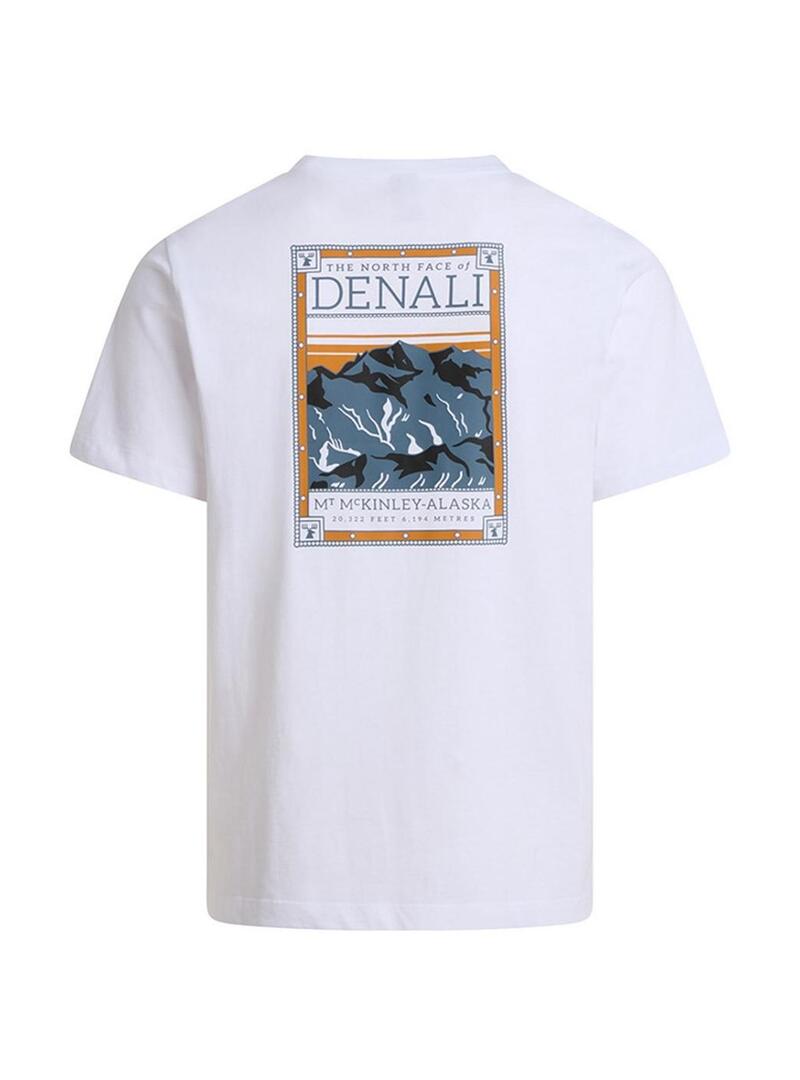 Camiseta The North Face. Modelo Denali. Cor branco. Gola redonda. Manga curta. Ajuste levemente folgado. Logo estampado no peito. Ilustração do pico Denali estampado nas costas. Detalhes em azul e laranja.