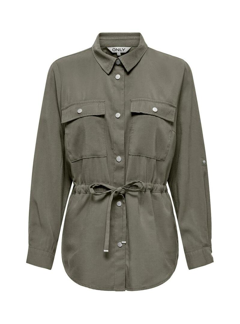 Camisa sobreposta Only. Modelo Latis. Cor verde. Fecho com botões metálicos de pressão. Gola camiseira. Bolsos de remendo no peito com aba. Cintura ajustável com cordão. Manga ajustável.