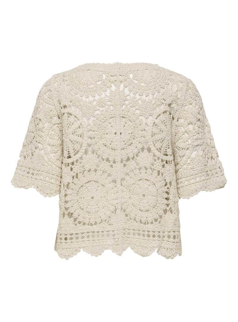 Camiseta Only. Modelo Waterly. Cor bege. Gola redonda. Manga curta. Acabamento em ondas. Tecido de crochê. Ajuste quadrado.