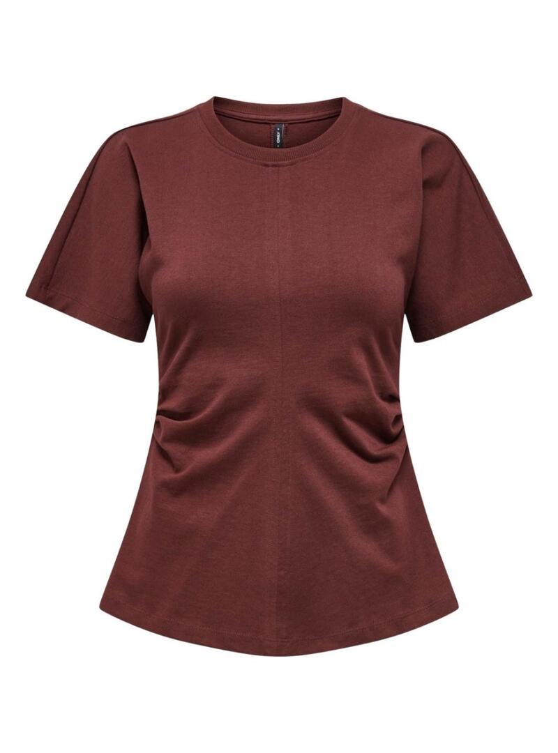 Camiseta Only. Modelo Marie. Cor granate. Costura dianteira. Franzido lateral. Manga curta. Gola redonda. Ligeiramente ajustada na cintura.