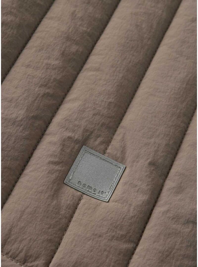 Casaco Name It. Modelo Melody. Cor marrom. Gola alta com tecido canelado. Fecho de zíper. Bolsos frontais com aba. Corte reto e folgado. Detalhe refletivo. Enchimento de poliéster. Comprimento clássico.