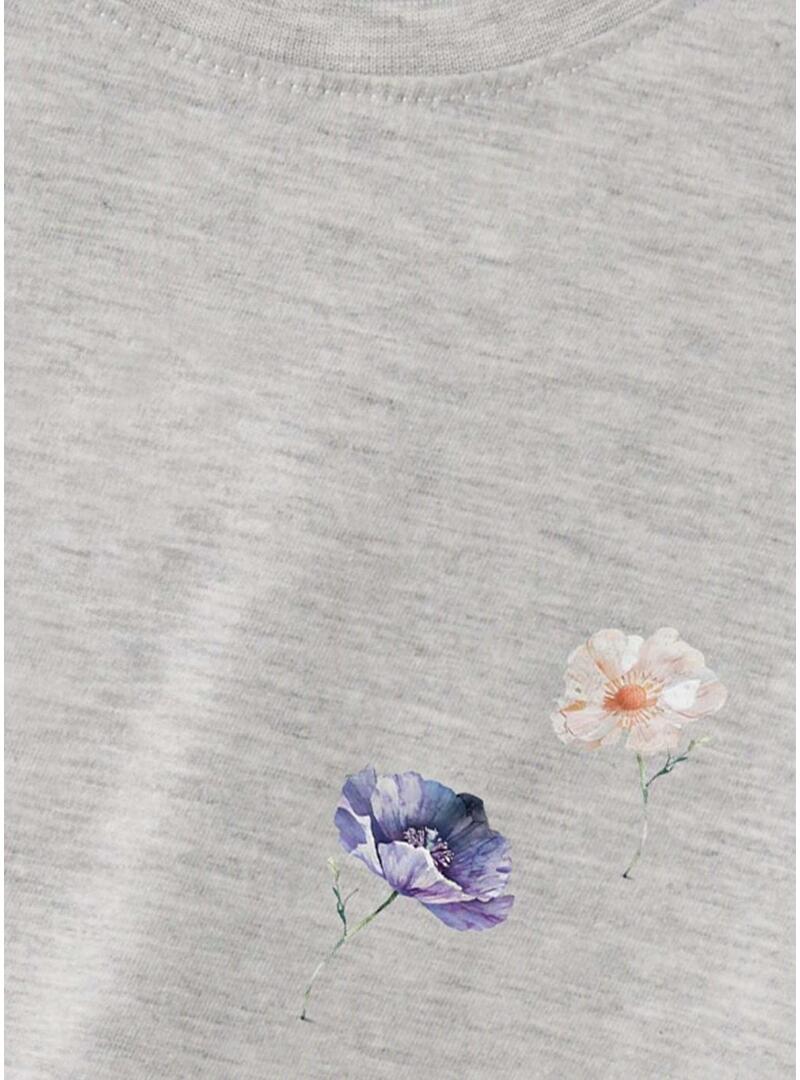 Camiseta Name It. Modelo Darmilla. Cor cinza. Gola redonda. Manga curta. Estampado na parte da frente e de trás. Corte folgado.
