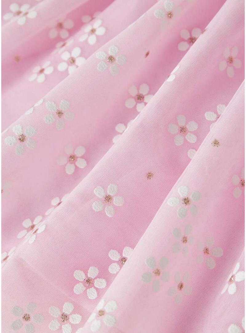Saia Name It. Modelo Floral. Cor rosa. Estampa de flores por todo o tecido. Detalhe de brilhos. Cintura elástica. Tecido de tule com volume.