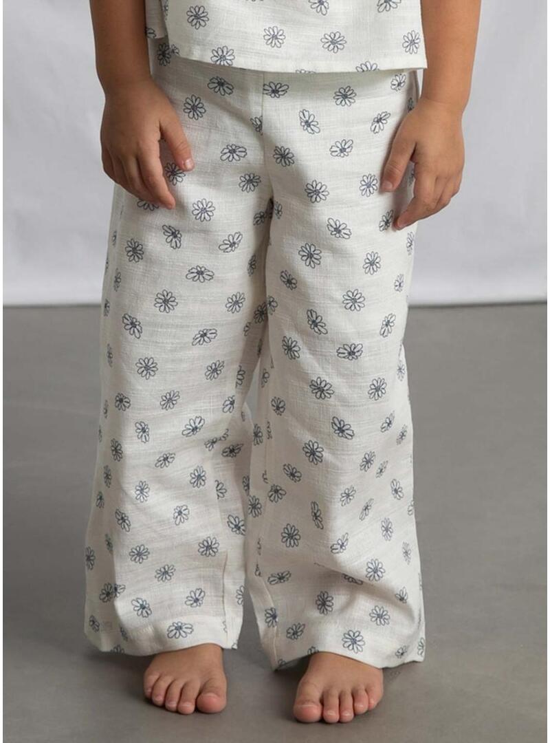 Conjunto Mayoral em cor cru com estampa floral azul. A camiseta tem gola redonda, mangas curtas com babados e um grande laço decorativo no ombro. Seu design evasê proporciona um acabamento muito doce e confortável. A calça comprida combinando completa o visual com um estilo coordenado e delicado.