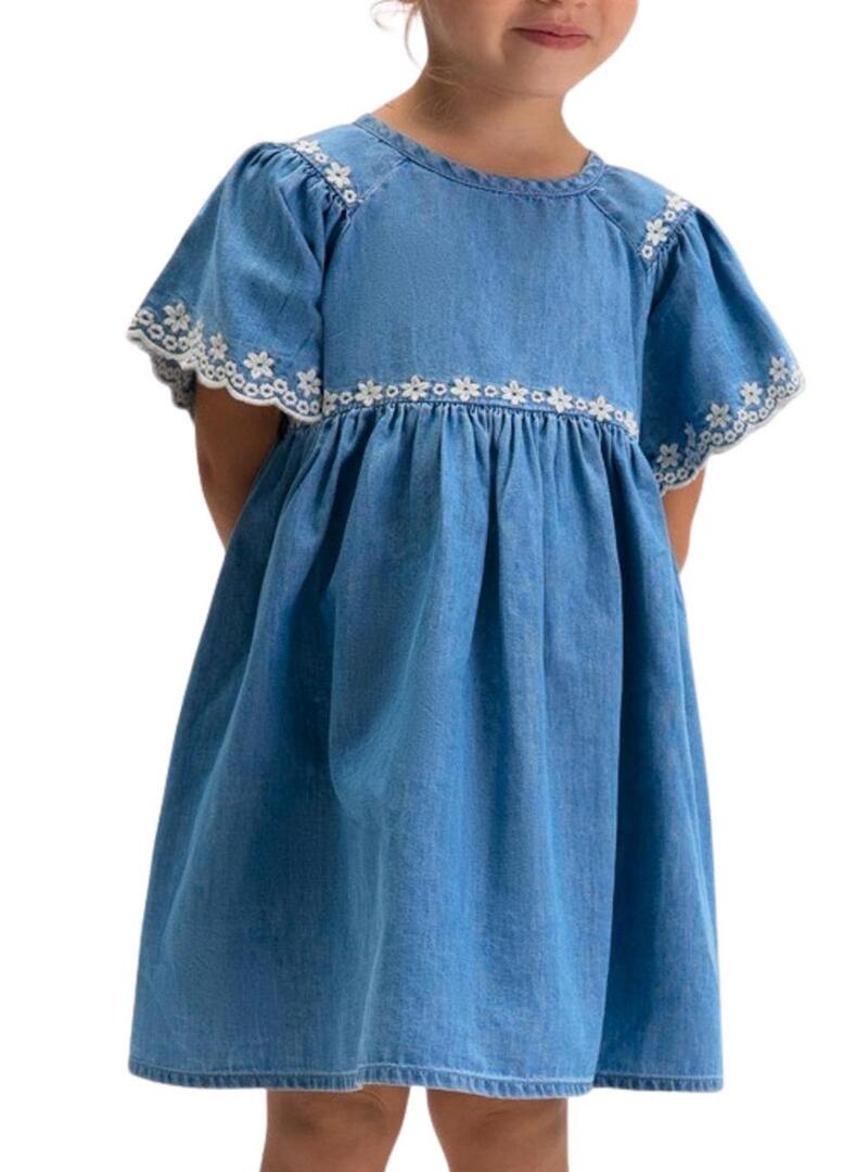 Vestido Mayoral de ganga leve com bordado floral azul médio para menina.