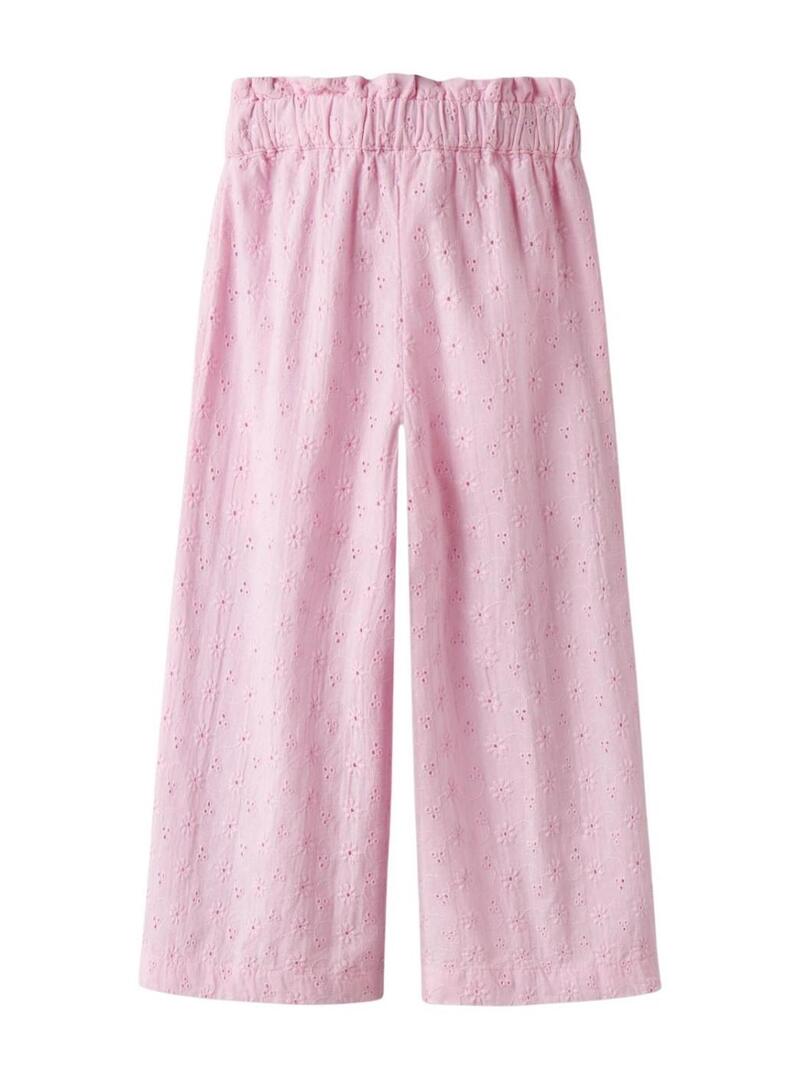 Calça Name It. Modelo Detines. Cor rosa. Cintura elástica ajustável. Perna reta folgada. Bordado inglês em todo o tecido. Elástico ajustável na parte interna da cintura. Formato folgado.