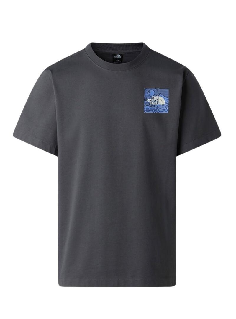 Camiseta The North Face. Modelo Mountain. Cor antracita. Gola redonda. Manga curta. Ajuste folgado. Ilustração estampada nas costas em azul e rosa. Logotipo estampado no peito.