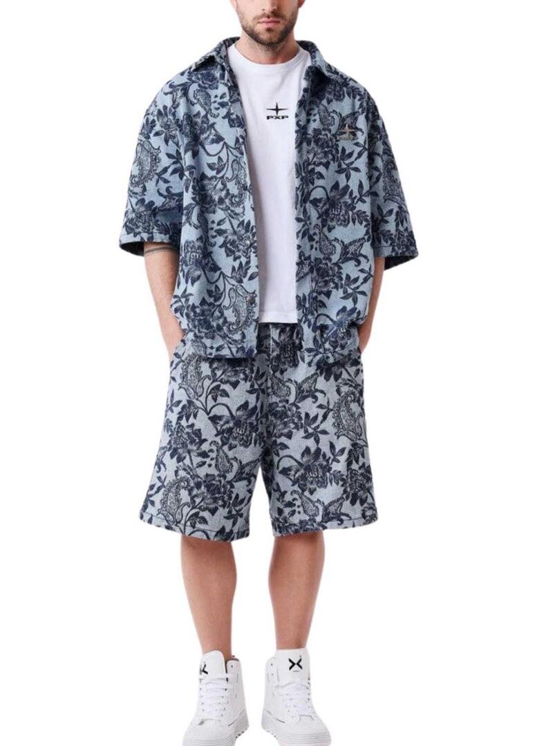 Camisa Project x Paris. Cor azul. Tecido texturizado jacquard. Estampa floral. Ajuste folgado. Corte quadrado. Manga curta. Fechamento com botões. Detalhe metálico no peito.