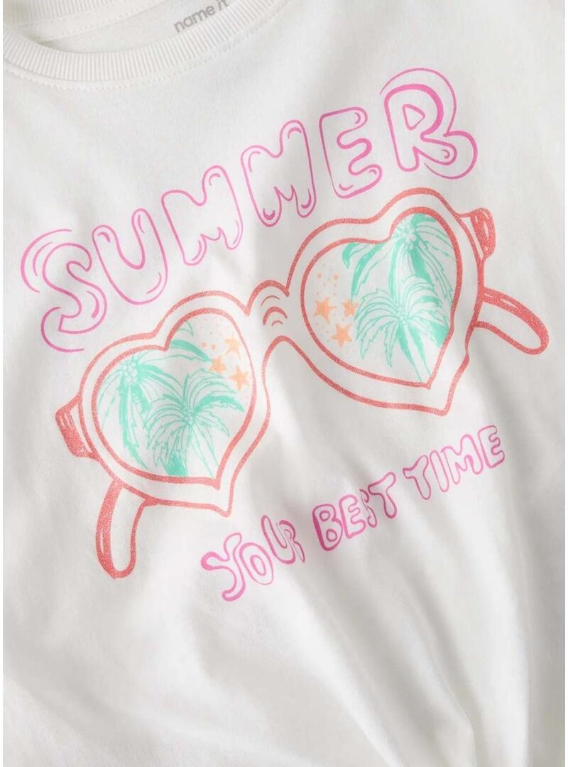 Camiseta Name It. Modelo Freya. Cor branca. Gola redonda canelada. Manga curta. Ajuste regular. Estampa de verão no peito. Nó decorativo na parte da frente.