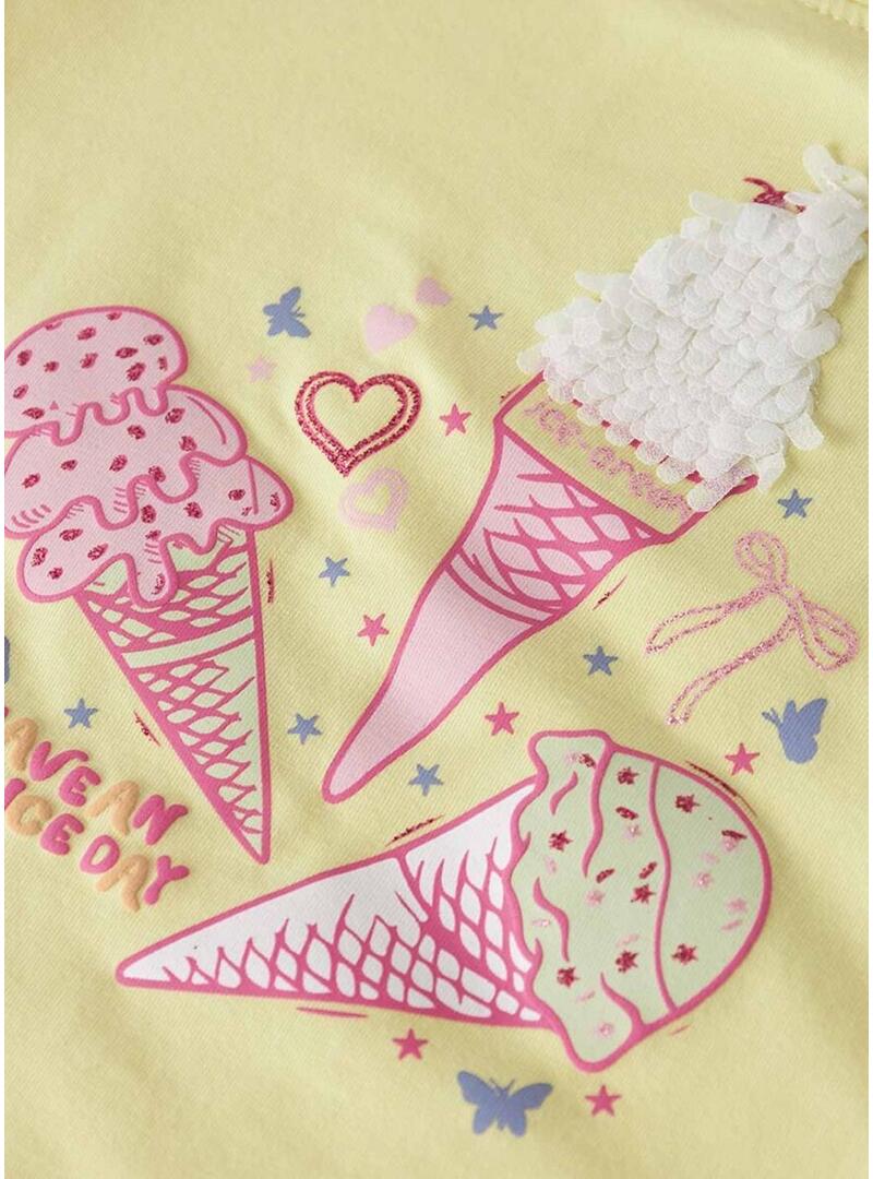 Camiseta Name It. Cor amarelo. Manga curta. Modelo Fentaz. Gola redonda. Estampado com sorvetes na parte da frente. Detalhes decorativos em relevo. Corte regular.