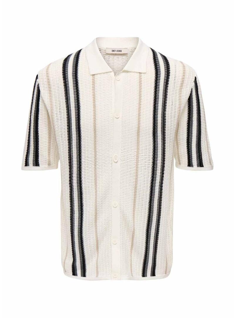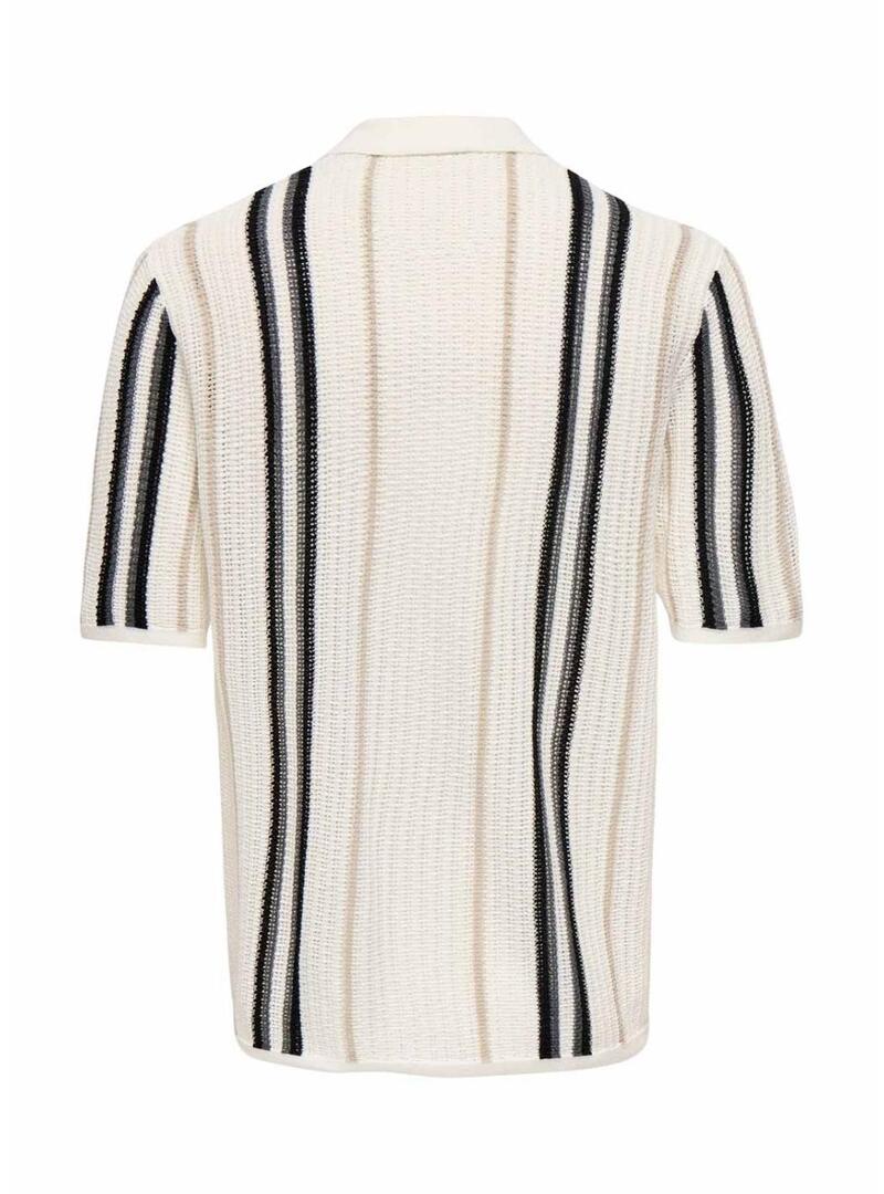 Camisa Polo Only and Sons. Modelo Leon. Cor bege. Estilo cardigã. Fechamento com botões frontais. Manga curta. Gola camiseira. Ajuste folgado. Malha de ponto com listras verticais em cor.