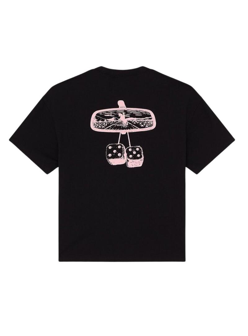 Camiseta Dickies. Modelo Polk. Cor preta. Logo estampado no peito. Ilustração do retrovisor estampada nas costas. Detalhes em rosa. Manga curta. Ajuste folgado. Corte boxy. Etiqueta lateral da marca.