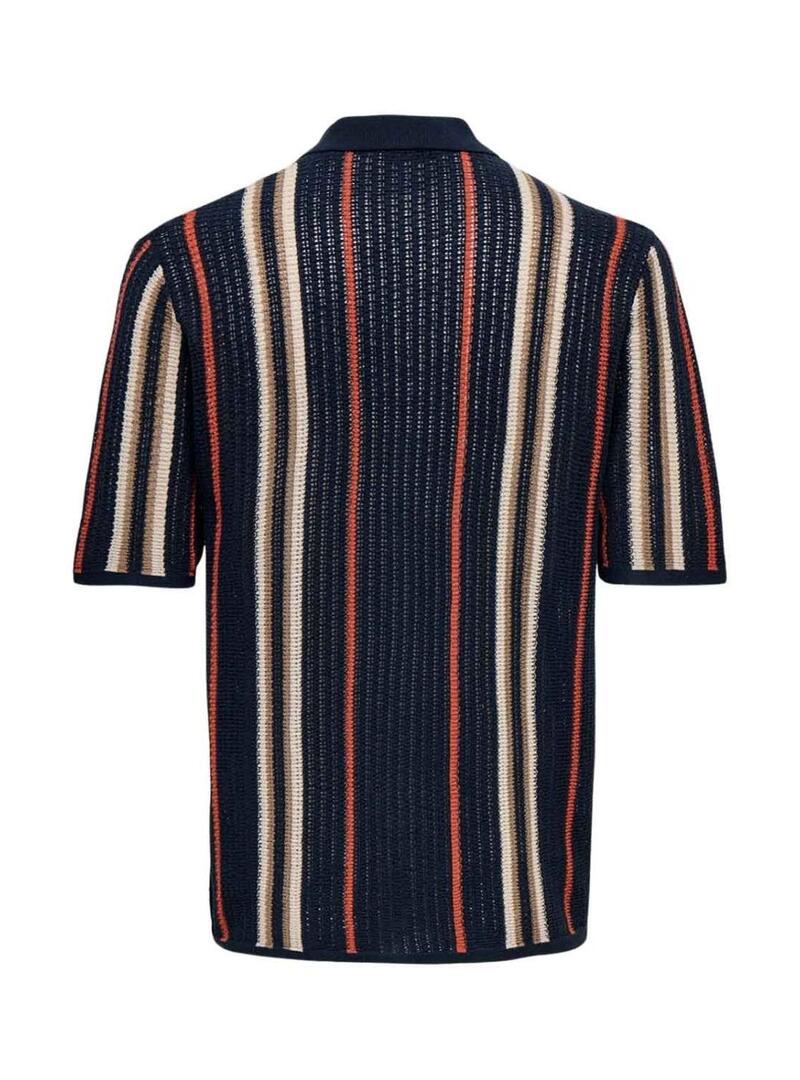 Polo Only and Sons. Modelo Leon. Cor azul marinho. Estilo cardigã. Fechamento com botões frontais. Manga curta. Gola camiseiro. Ajuste folgado. Tecido de malha com listras verticais na cor.