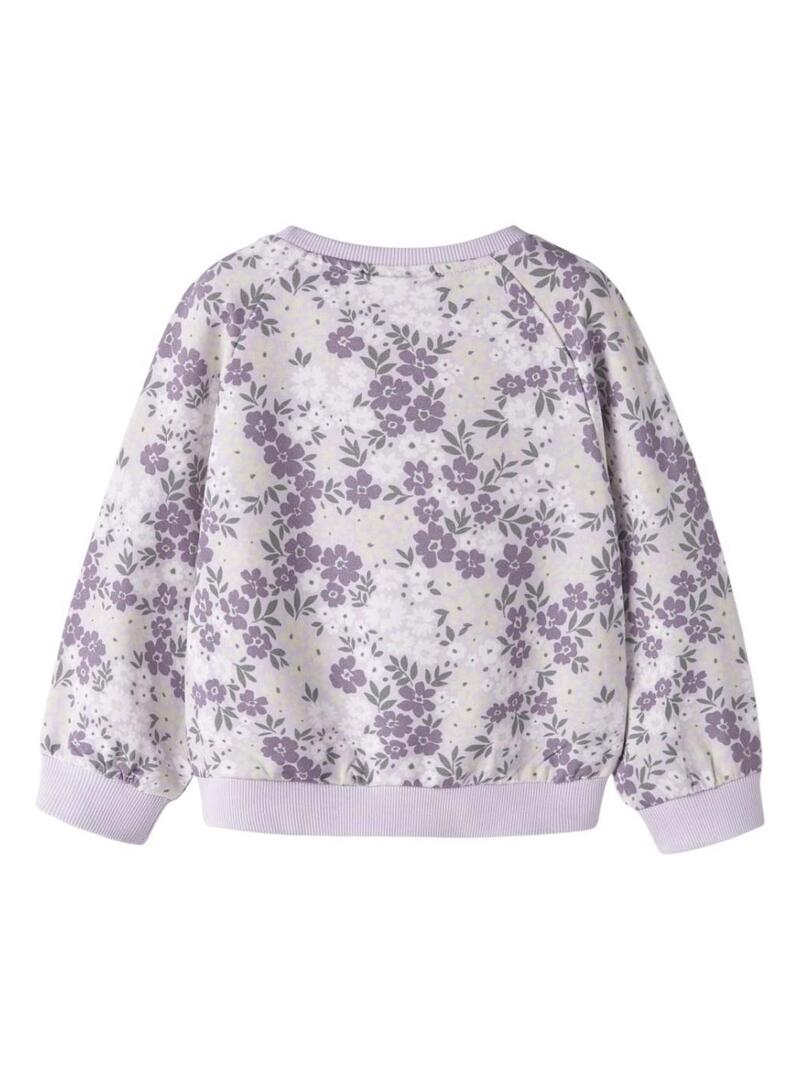 Camisola Name It. Modelo Dartia. Cor violeta. Estampa floral. Gola redonda. Acabamentos canelados. Corte regular. Tecido liso nos acabamentos. Tecido de camisola não escovado. Feito em algodão orgânico.