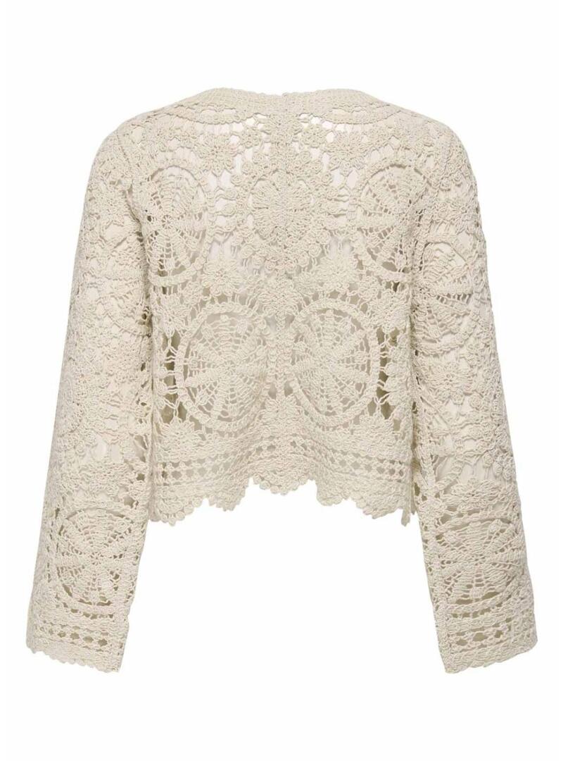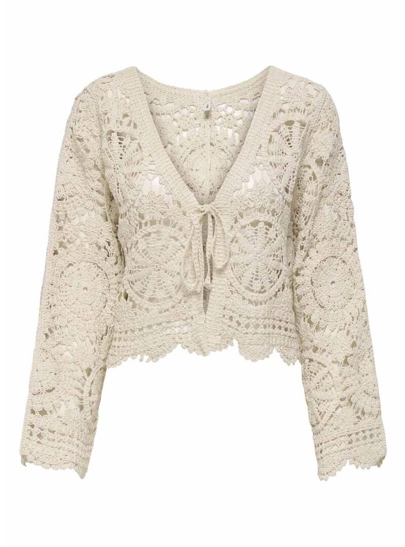 Casaco Only. Modelo Waterly. Cor bege. Tecido de crochê. Fechamento com cordões na frente. Manga comprida. Ajuste folgado.