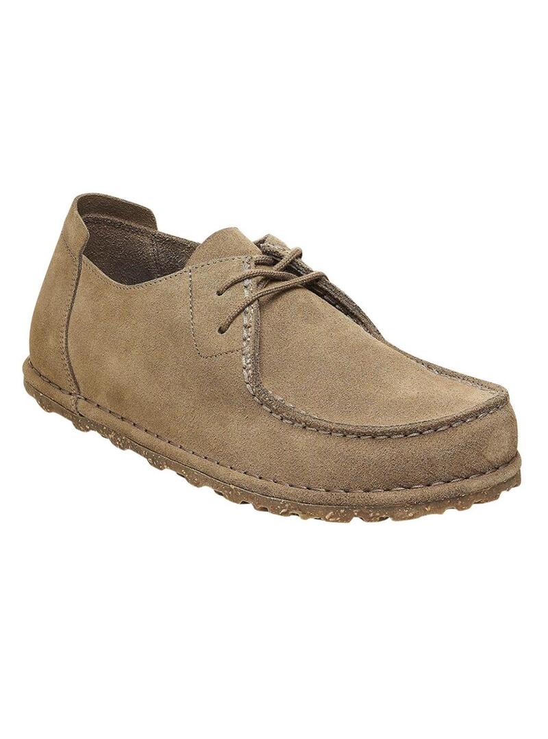 Sapatos Birkenstock. Modelo Utti Lace. Cor beige. Design atemporal estilo mocassim. Confeccionados em camurça macia. Puxador traseiro que facilita um ajuste confortável e prático. Palmilha anatômica removível Deep Blue original da BIRKENSTOCK, forrada em microfibra para maior conforto. Sola de borracha de látex com elementos de cortiça, flexível e resistente.