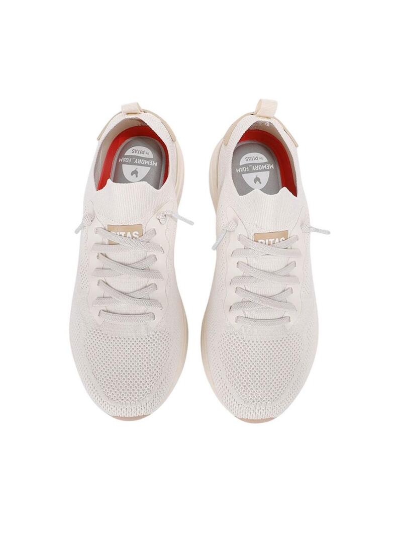 Sapatilhas Walkin Pitas. Modelo Cue. Cor areia. Fecho com cadarços elásticos. Fabricado em poliéster reciclado de garrafas PET. Parte superior em malha respirável. Palmilha de memory foam removível. Sola Comfort de 3 cm feita em EVA ultraleve.