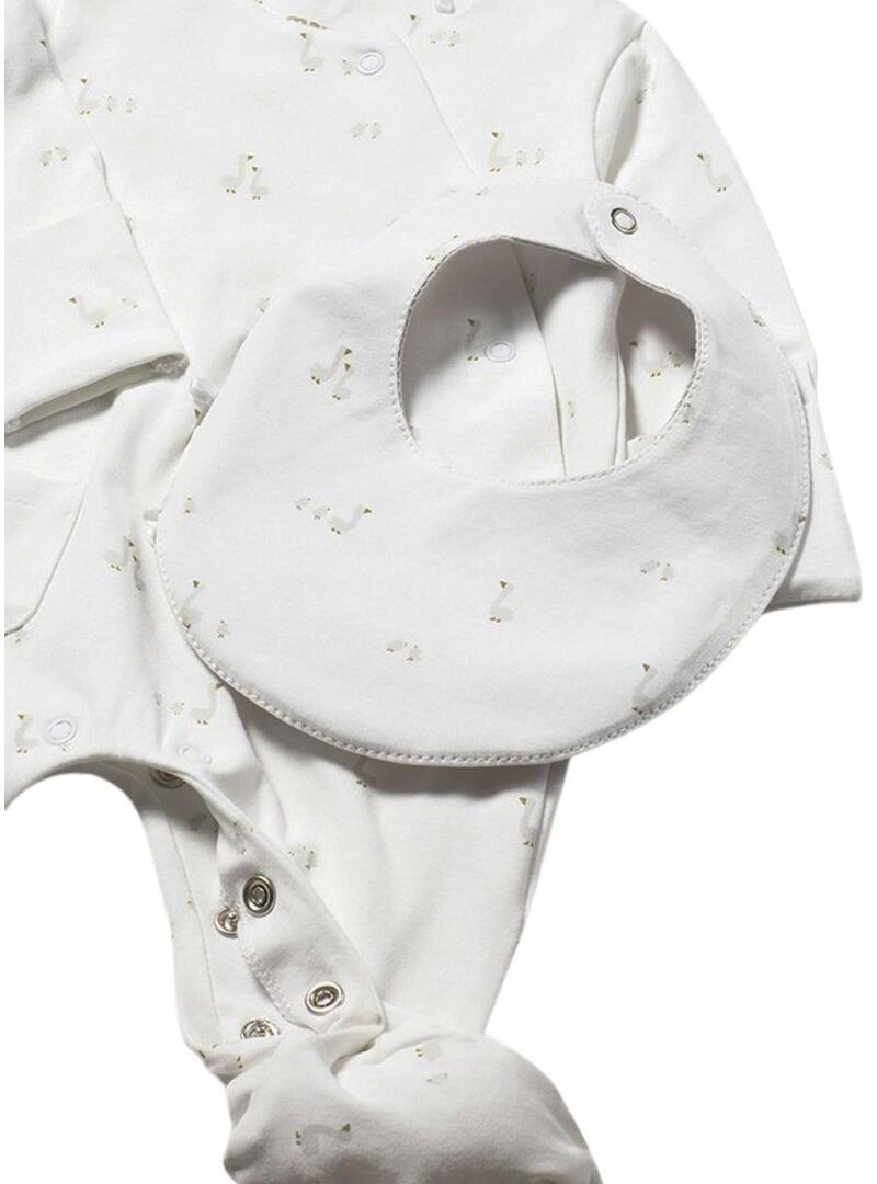 Conjunto de recém-nascido Mayoral em tons suaves, composto por macacão branco de manga comprida com pés, babador e touca combinando. Possui gola camiseira, fecho lateral com botões de pressão e uma estampa mini delicada que proporciona um acabamento fofo e elegante. Detalhe bordado na parte da frente.