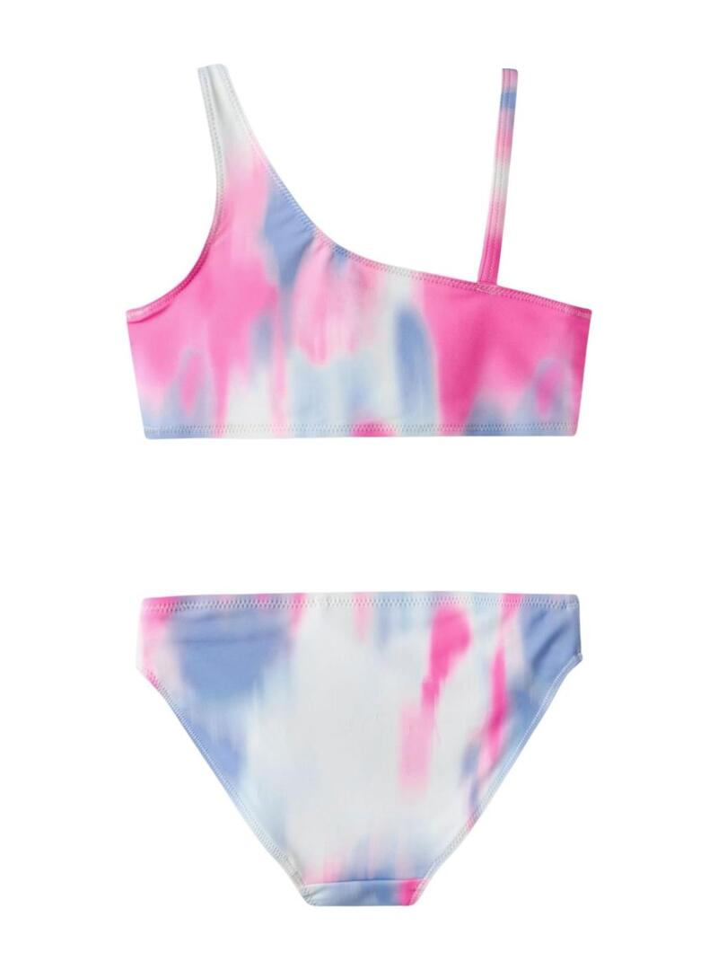 Biquíni Name It. Modelo Zie. Estampado em azul, rosa e branco. Decote assimétrico. Forro de poliéster. Uma alça fina.